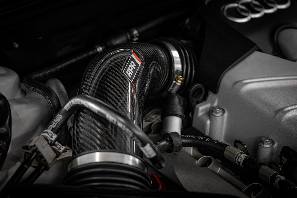 The APR Carbon Fiber Throttle Inlet Pipe is a massive upgrade over the complex factory inlet pipe. Reducing restrictions before the throttle body is necessary to maximize performance on this system. Our system is smooth and direct, and doesn't have extra resonators or restrictions like the factory system. The result is simple: it flows 20% better than stock, sounds better, looks better, and perfectly complements our open intake system!