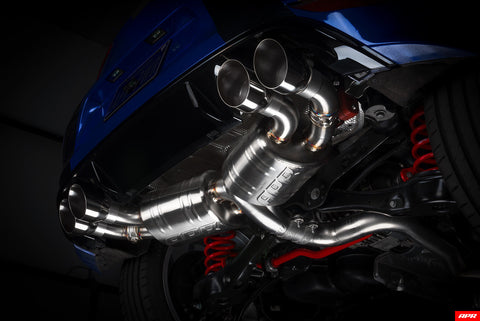 The APR Catback Exhaust System personalizes your vehicle’s looks, sound and performance. Beautifully hand-crafted T304-stainless-steel components adorn the system with stunning TIG-welding throughout. Our straight-through brushed-finished mufflers smooth the exhaust note to a deep growl, without adding restrictions, while our Helmholtz resonator reduces unwanted frequencies. Strong high-quality bracketry and OEM-style clamps hold the system steadily in place, making the install or removal a snap, and fitment simple, yet precise. A cast 3” to quad 2.5” rear splitter creates an ultra-smooth transition, steadily feeding exhaust gasses out of the system, while looking tidy from under the rear bumper. Our cast valve housings enable the vehicle to be fitted with the factory electronic valve actuators, retaining OEM valve operation. Finally, removable 4" polished slash-cut exhaust tips finish the system, adding a classy motorsport-inspired touch to the rear of the vehicle.